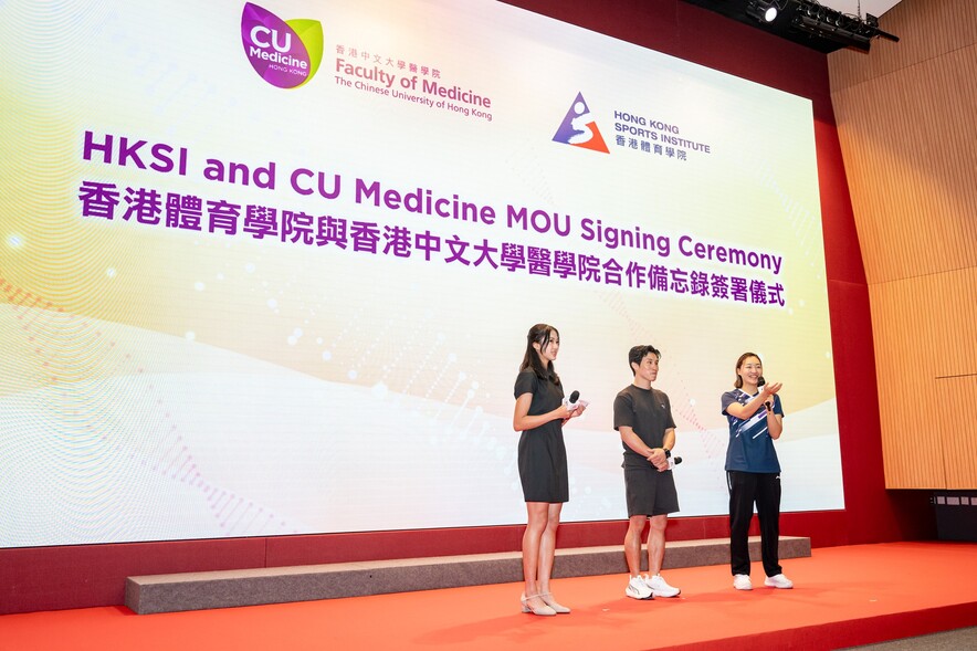 Gymnastics coach Shek Wai-hung (centre) and badminton athlete Tse Ying-suet (right) shared how they have benefitted from sports medicine support of the HKSI and CU Medicine.