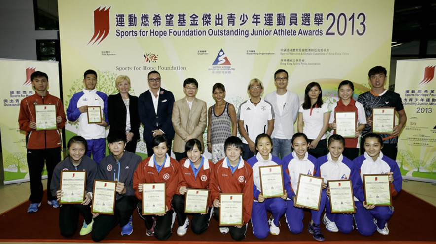 頒獎典禮主禮嘉賓包括香港體育學院院長李翠莎博士(後排左三)、運動燃希望基金創辦人利蘊珍小姐(後排中)、中國香港體育協會暨奧林匹克委員會副會長余國樑先生 MH JP(後排左五)及香港體育記者協會副主席趙燦輝先生(後排右五),聯同特別嘉賓退役田徑運動員,前香港跳遠紀錄保持者陳家超(後排左四)、(後排右三起)現於體院任助理教練的退役壁球運動員趙詠賢和退役劍擊運動員黃金球,與運動燃希望基金傑出青少年運動員二零一三年第一季得獎者合照。