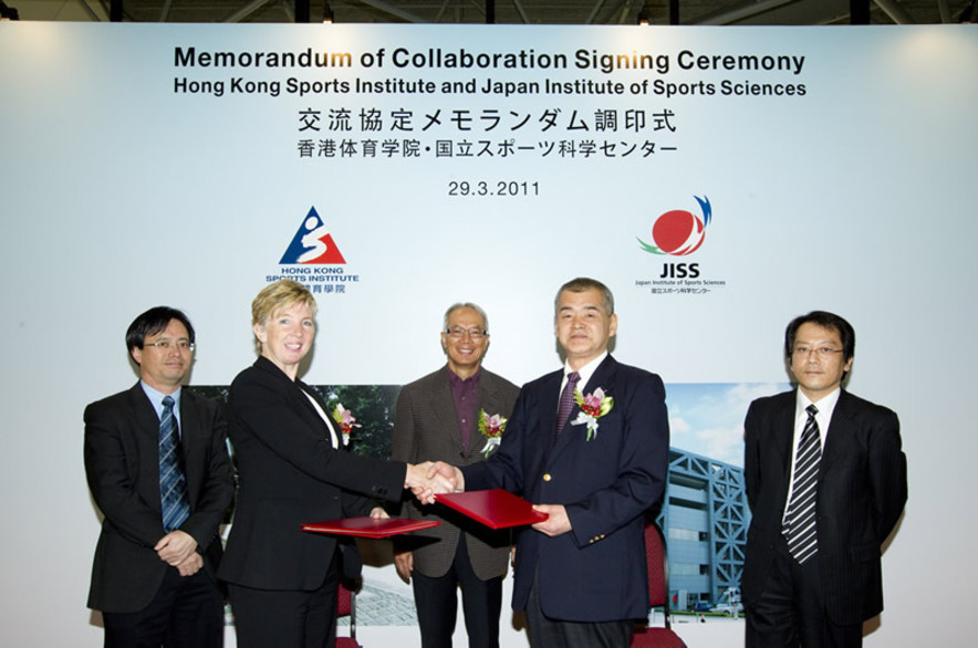 體院院長李翠莎博士(左二)與日本國立運動科學中心及國立訓練中心主管岩上安孝(右二)在體院副主席鄧桂能(中)、體院運動科學及醫學統籌主任蘇志雄博士(左)及日本國立運動科學中心運動資訊所副主任和久貴洋(右)的見證下,簽署合作協議備忘錄。